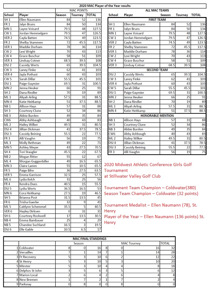 St. Henry’s Ellen Naumann was named Player of the Year , edging out Ft. Recovery’s Jalyn Bruns by just 2 points in the final standings. Naumann was the medalist with a 78 round in the tournament securing her the honor.
