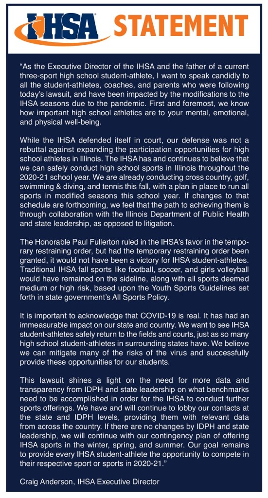 (10-3-20) Illinois High School Association (IHSA) Executive Director Craig Anderson issued the following statement on this week’s court hearing by a group of parents. The injunction by the parents group was rejected.