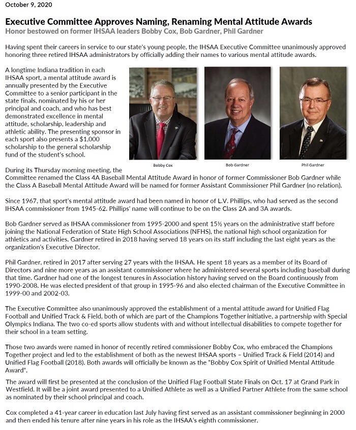 athletics, Indiana IHSAA To Rename Mental Attitude Awards Date: October 9, 2020Author: statelinesportsnetwork 0 Comments Share this: Click to share on X (Opens in new window) X Click to share on Facebook (Opens in new window) Facebook Like Loading...