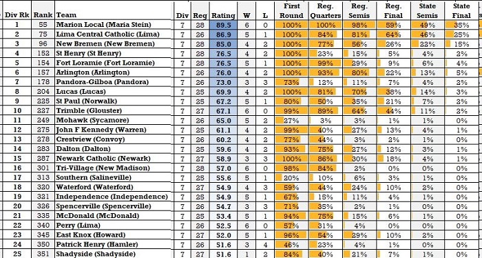 D-III, you have to hope the OHSAA doesn’t pair Regions 9 and 12 together in the state semifinals. The top 8 teams in the division are all from those 2 regions. But over in Region 10, look out for [12] West Holmes at [5] Cloverleaf for a potential 5-12 upset. The Projection Index likes the Knights by double digits over the hosting Colts.