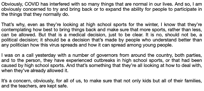 (10-14-20) Illinois Gov. JB Pritzker made a statement today about ‘outbreaks’ taking place in other states that have fall sports in play.