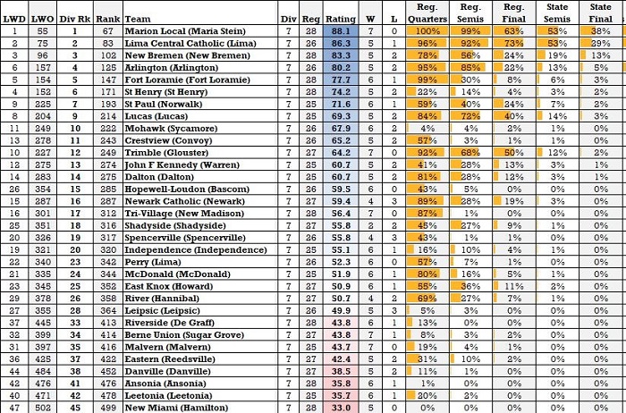 With 32 teams left in D-III, it is a coin flip as to who will win the state title between [1] Chardon and the other 31 teams combined. Despite ranked 4th in the Projection Index, [6] SVSM will be a slight underdog at [3] Canfield in the regional quarterfinals. And locally, [8] St. Marys will be a 20-point underdog at [1] Bellbrook on Friday.