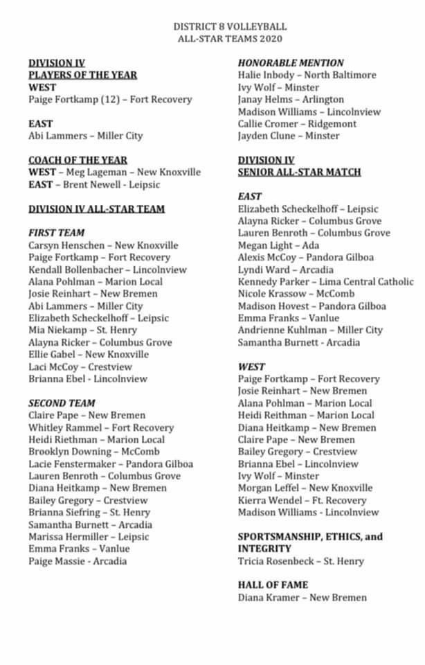 (10-26-20) The D IV District 8 Volleyball Teams have been released.