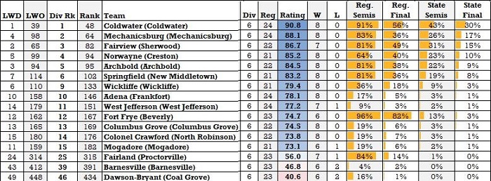 Staying down in SW Ohio, the D-II regional semifinals feature a battle of the undefeated between Kings at Winton Woods. Last season, Winton Woods was the highest rated team in the Projection Index to not make the OHSAA Playoffs. Now, as part of the Eastern Cincinnati Conference, the Warriors’ schedule is more fitting to their school size and will benefit the school for years to come.