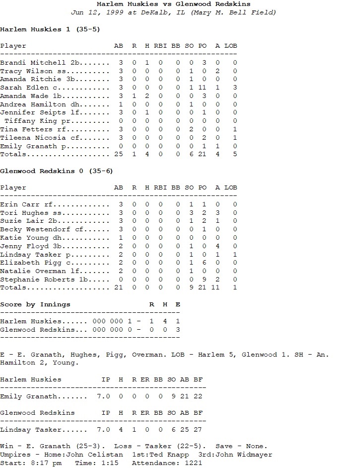 Granath (25-3) had just pitched the first title-game no-hitter in Class AA history (third overall) and was named the tournament MVP (21 IP, 6 H, 1 R, 0 ER, 0 BB, 25 K). Her throwing error allowed the only runner for Glenwood and kept her from having a perfect game.