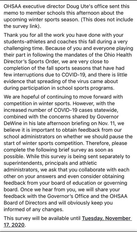 UPDATED: 11-12-20 Zeps Hoops (@zepshoops) for Shenandoah HS Basketball tweeted the following on a survey sent out by the OHSAA on winter sports participation –