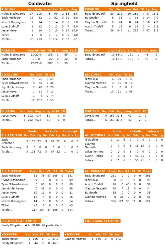 Senior quarterback Myles Blasingame was responsible for all five Coldwater touchdowns. He was 11-for-20 passing for 185 yards and three touchdowns and ran for 99 yards and two touchdowns on 17 carries.