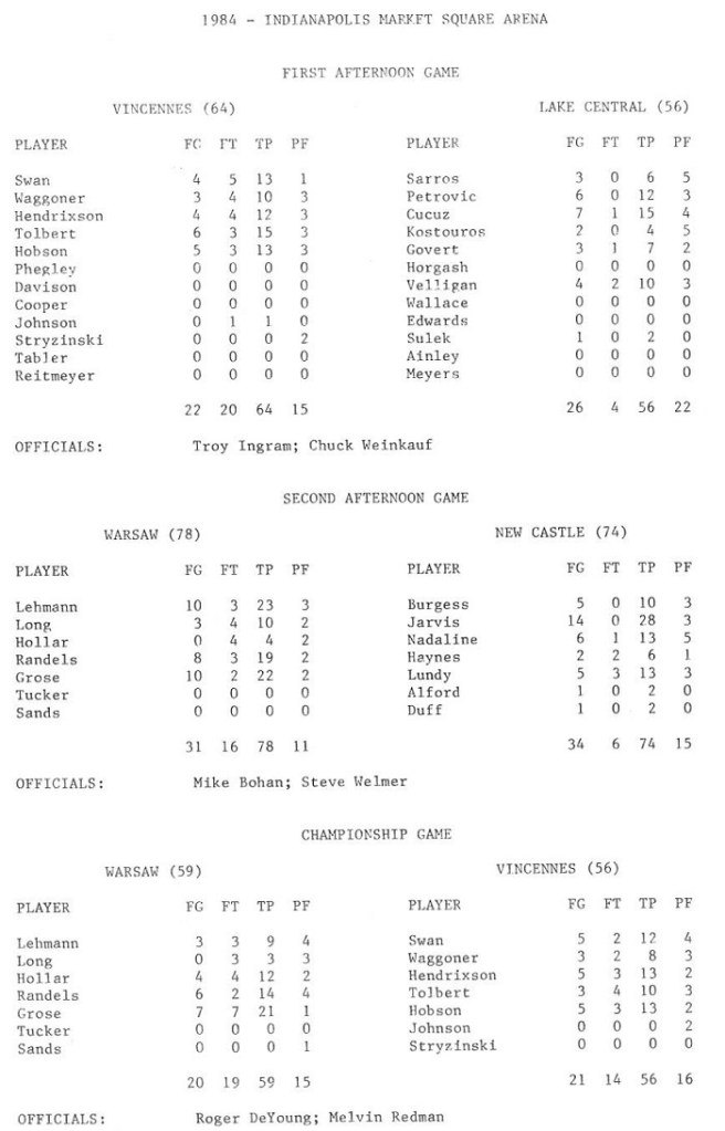 Hickory played at Butler University’s Hinkle Fieldhouse, Warsaw played at the Market Square Arena (now demolished), both in Indianapolis