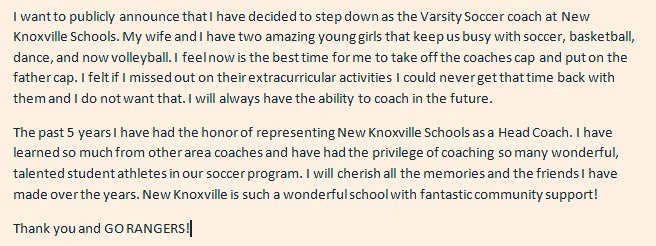 (12-16-20) After five seasons as the New Knoxville head boys soccer coach Matt Stetler has decided to step down. In a tweet today he said his good-byes and thank you –
