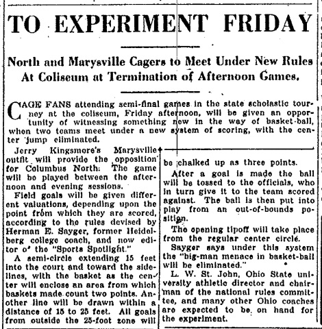 1932: Culver, Indiana native Herman ‘Suz’ Sayger put on an exhibition game between high school teams, Tiffin Junior Home and Tiffin Columbian, in Ohio using a new scoring system that counted three points for a shot beyond 25 feet, two points for a shot between 15-25 feet, and one point for a shot inside 15 feet. Tiffin Junior Home defeated Tiffin Columbian, 21-18.