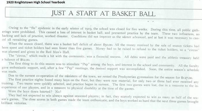 Much like today the world was in the midst of a pandemic, the Spanish flu, that affected basketball even in Knightstown, Indiana in 1919 and 1920. Financial issues cut into high school sports during this time, but despite all of that basketball would recover.