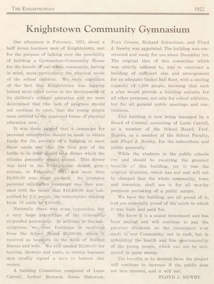 It was decided in 1921 to build a new facility, Knightstown Community Gymnasium, in December construction started and thanks to a community drive for the funding of a project like this…it was on its way.