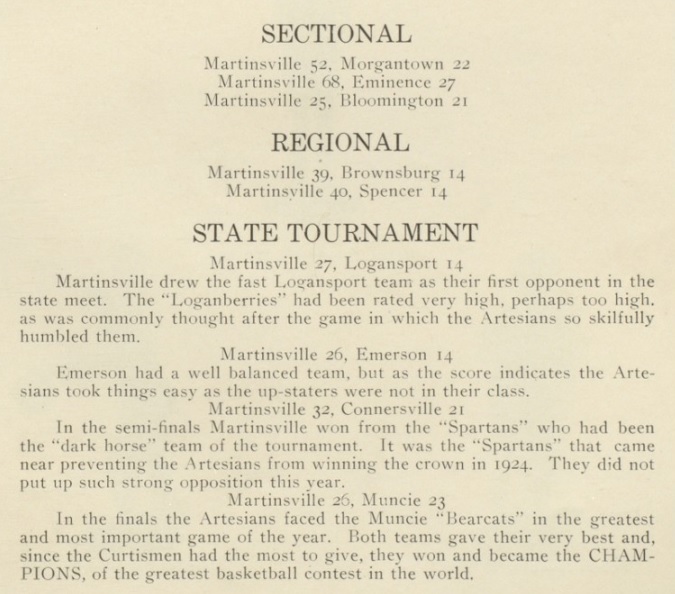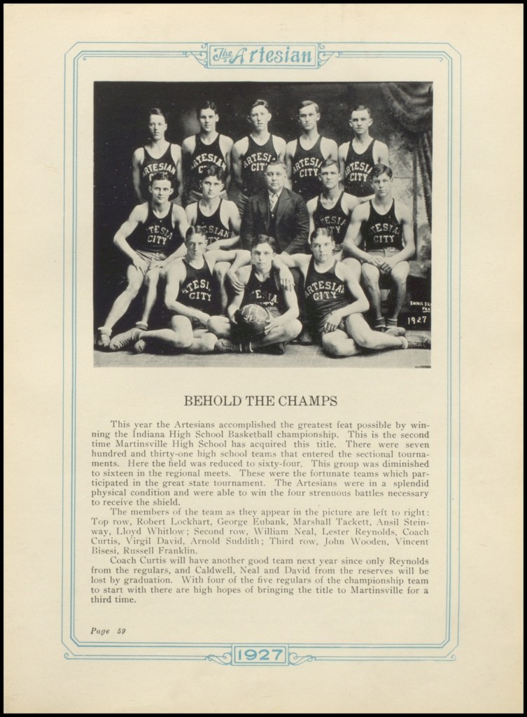 Martinsville won the 1927 IHSAA Single-Class State Title. In the Semifinal game Wooden would score 10 points and in the Championship game he would score 13 points. Impressive numbers when you realized he scored 23 of the team’s 58 points in the two games.