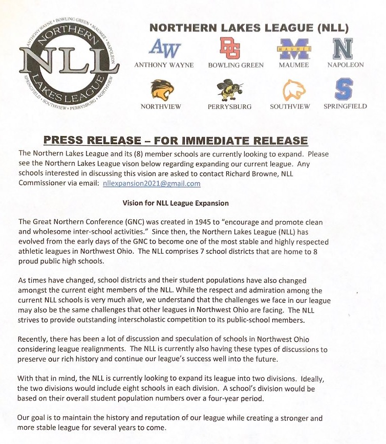 (1-15-21) The Northern Lakes League (NLL) sent out a press release announcing they are looking to double in size in the future, from 8 to 16 members and two divisions.