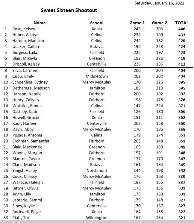 The girls bowled very well today to finish 5th in the Centerville Sweet 16 tournament. Bowling on the OHSAA sectional and district pattern for the first time this season, they put up games of 948 and 924. Ashtyn Huber