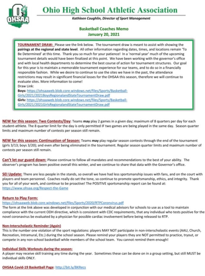 BASKETBALL: The regional and state tournament sites are all to be determined. It is not yet known which of the previously announced sites will permit events to be held at their venue, or which will allow spectators. The OHSAA intends to use neutral sites for the regional tournaments