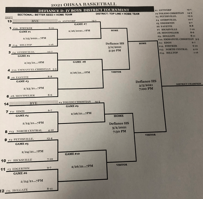 boys basketball, ohio 2021 OHSAA Boys Basketball State Tournament Brackets Date: February 7, 2021Author: statelinesportsnetwork 0 Comments (2-7-21) Today teams found out who they play in the upcoming OHSAA boys basketball tournament. D IV D III D II D I Share this: Click to share on X (Opens in new window) X Click to share on Facebook (Opens in new window) Facebook Like Loading...