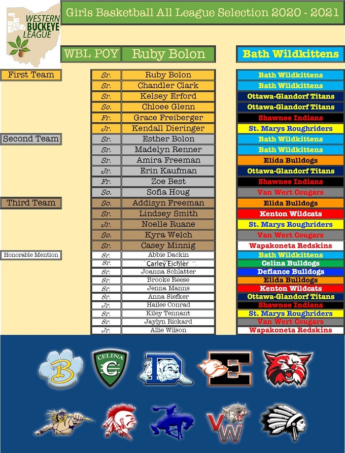 Bath’s Ruby Bolon was named the WBL’s Player of the Year after helping the Wildcats win a league title. She was joined on the 1st team by teammate Chadler Clark. O-G placed two players on the 1st team Kelsey Eford and Chloee Glenn. Also named to the 1st team were Shawnee’s Grace Freiberger and St. Marys Kendall Dieringer.