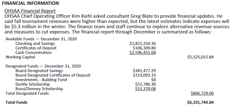 OHSAA financial information from January 14th Board Meeting –