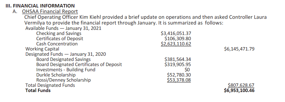 The last updated financial statement on the OHSAA web site is from the February Board Meeting –