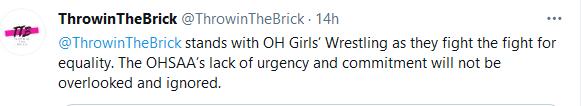 (5-20-21) The Ohio High School Wrestling Coaches Association tweeted yesterday on girls wrestling not being sanctioned this coming year –