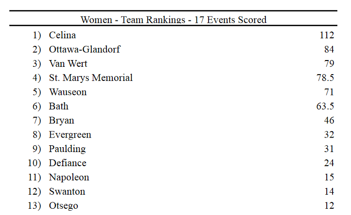 (5-21-21) Today at the D II Northwest District Track and Field Meet in Defiance, the Celina Girls outscored league rival and 2nd place O-G 112-84 to pick up the championship trophy.