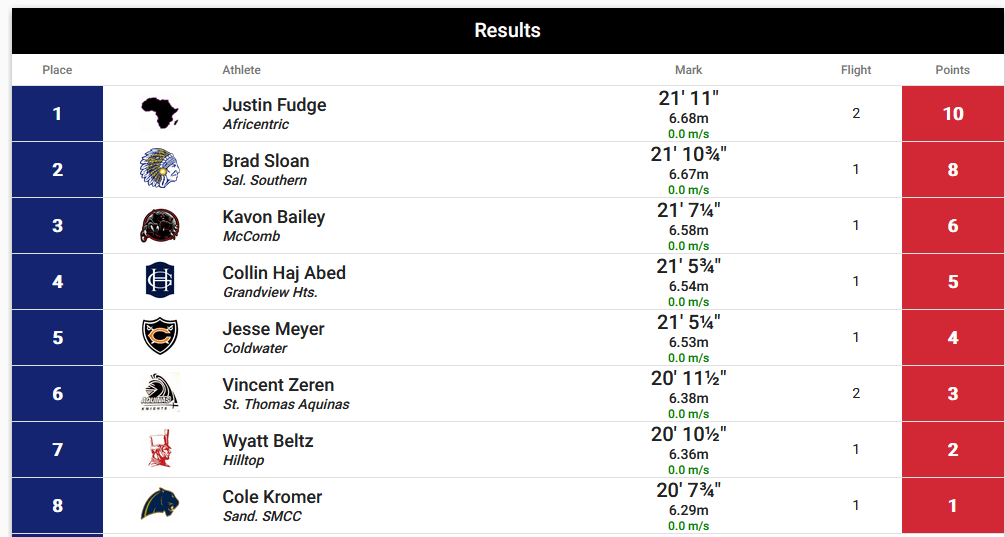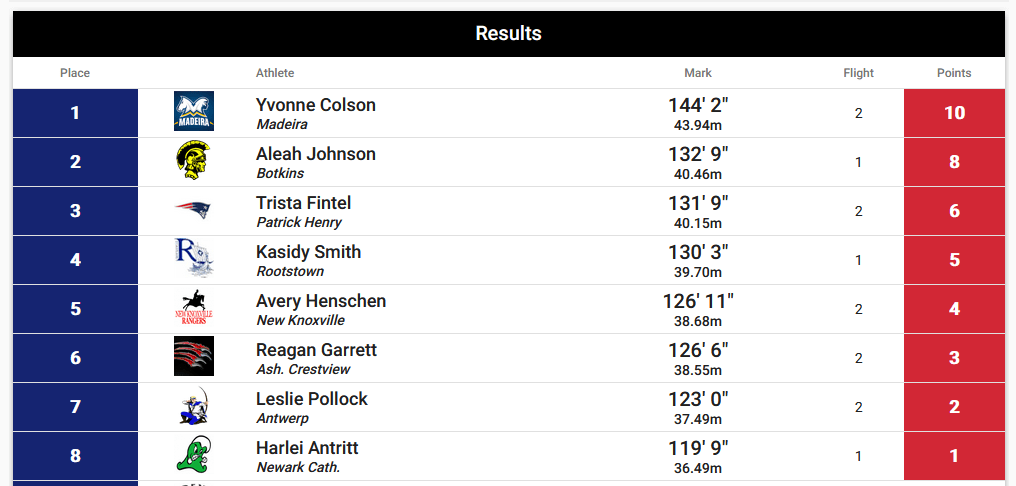 Making the podium on the 1st day were New Knoxville’s Avery Henschen in the Discus, Coldwater’s Jesse Meyer in the Long Jump.