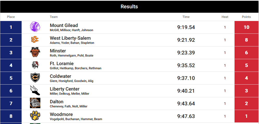 Two MAC schools made the podium in the 4X800 Relay, Minster was 3rd and Coldwater 5th.