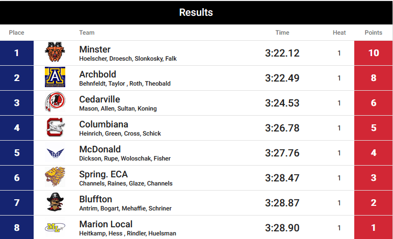 - 4×800 meter relay: Minster’s Brady Hoelscher, Josh Niekamp, Mathew Droesch and Alex Albers – 6th