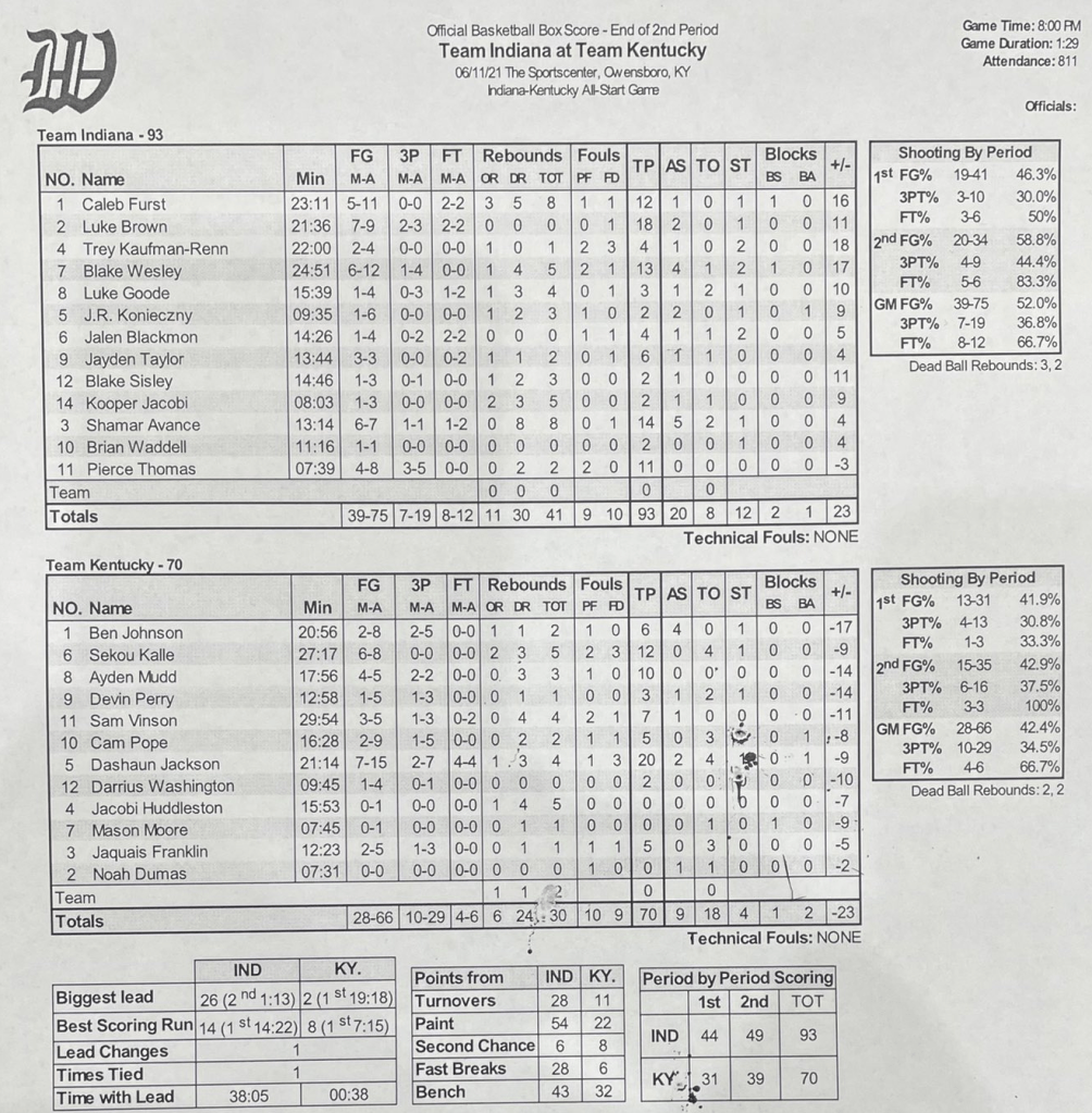(6-11-21) The Indiana Boys All Stars cruised to the win over Kentucky in Owensboro 93-70. The win gives the Hoosiers the sweep on the night as the girls picked up a win in the first game of the night.