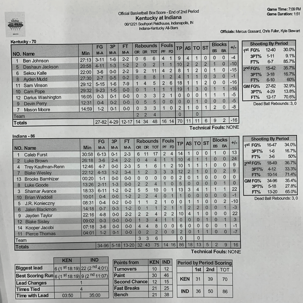 (6-12-21) The Indiana Boys All Stars swept the 2021 series with Kentucky winning tonight at the Southport Fieldhouse 86-70. Indiana led by as 22 points in the 2nd half.