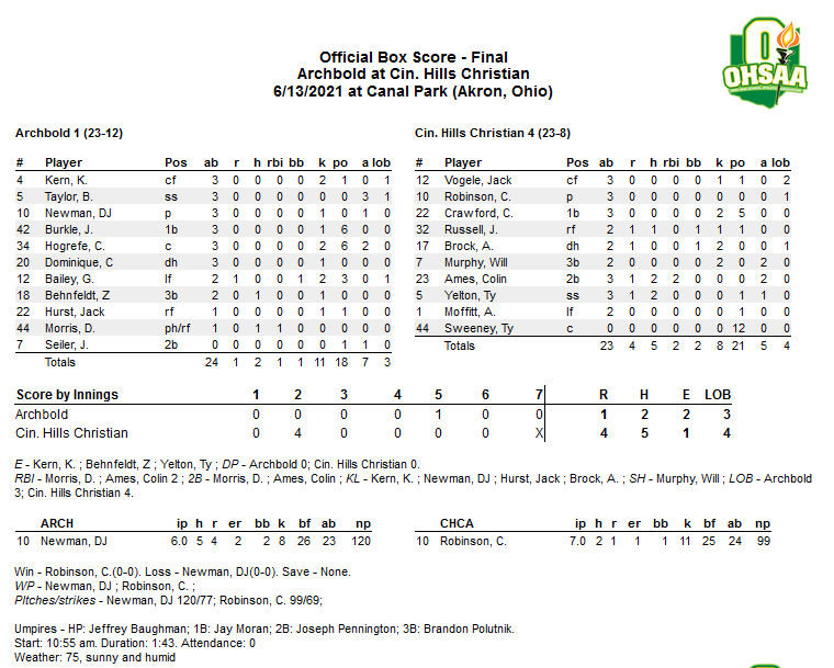 (6-13-21) Cincinnati Hill Christian Academy scored 4 runs in the 2nd inning and the Eagles’ Cooper Robinson shut down Archbold the rest of the way to beat the Blue Streaks 4-1 and claim the OHSAA D III state title.