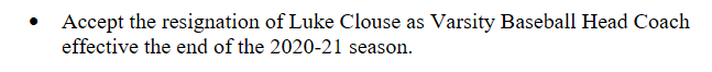 (6-17-21) This week during the Parkway Board of Education meeting they accepted the resignation of baseball Coach Luke Clouse.