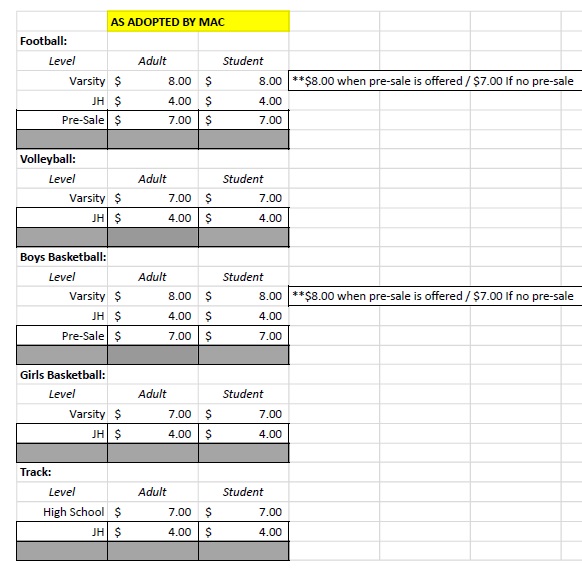 Below are the MAC 2021-22 school year ticket prices that were approved at the June Parkway board of education meeting.