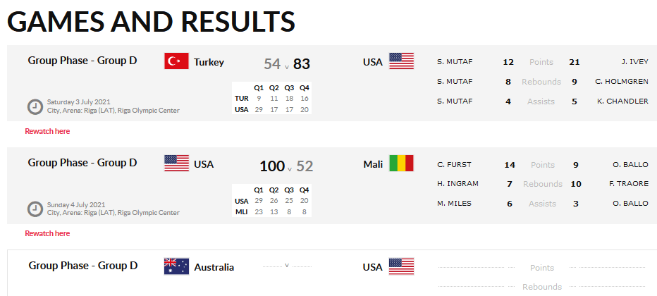 (7-4-21) The USA Men’s U19 World Cup Team (2-0) celebrated the 4th of July beating Mali 100-52. The Victory was the 100th win all-time for the USA in U19 competitions and improved USA’s U19 record in Fourth of July games to 5-0.