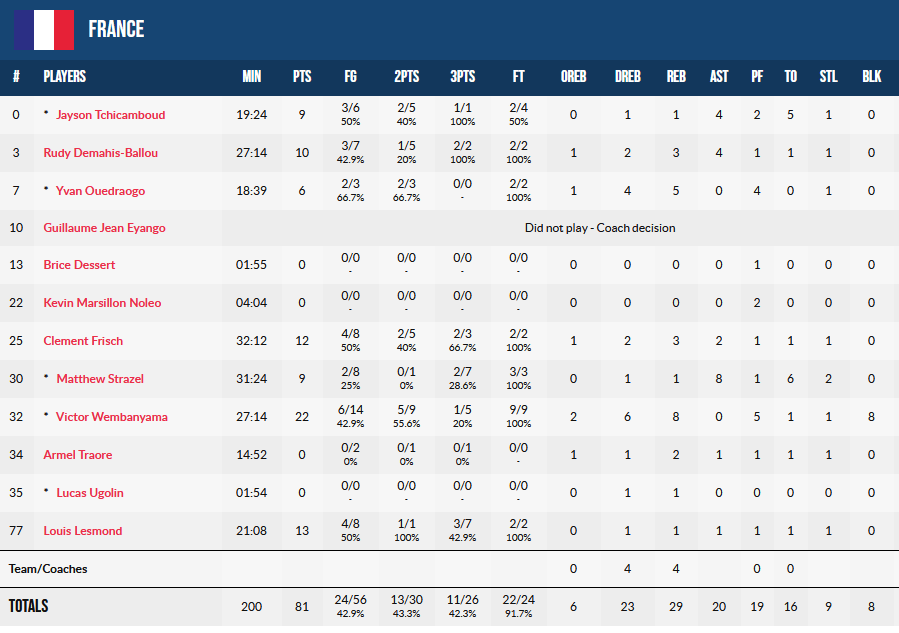 Turning point: France led 68-64 early in the fourth quarter when Chet Holmgren took over, drawing two fouls on French star center Victor Wembanyama to send him to the bench while scoring five straight points to start an 11-0 run for a 75-68 lead. France managed to cut the deficit back to two points with 28 seconds to play before Kenneth Lofton and Kennedy Chandler both grabbed offensive rebounds for the Americans in the closing seconds.