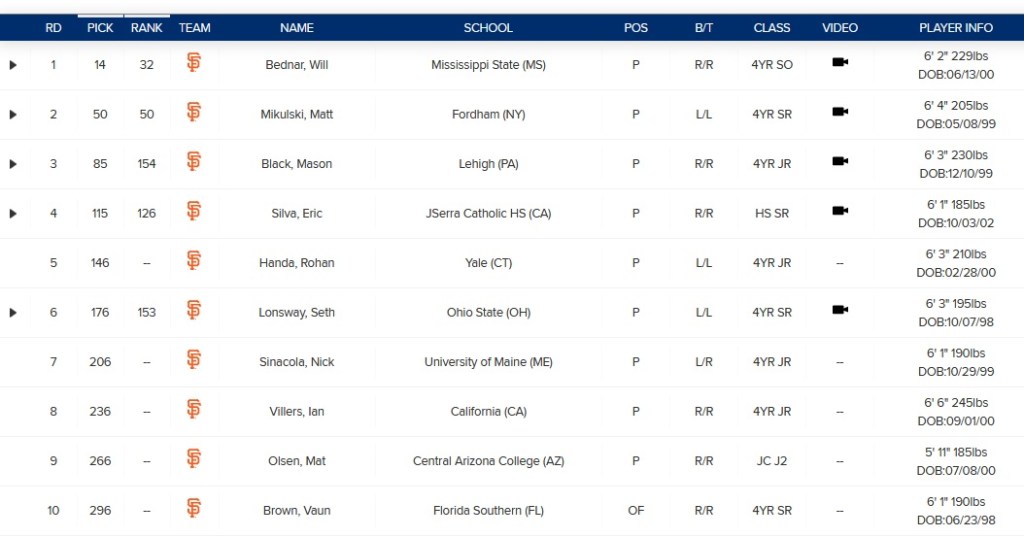 The first nine rounds of the draft saw the Giants draft all pitchers, in the 10th round they picked their first position pitcher.