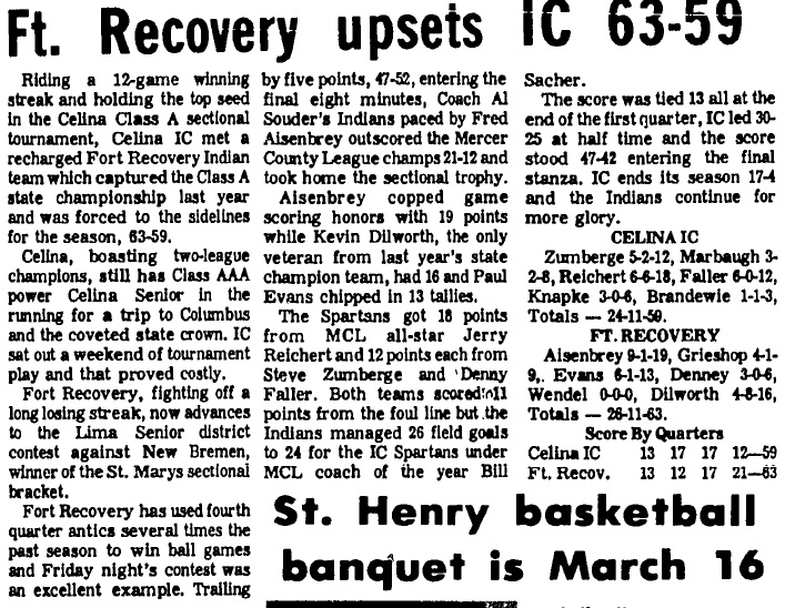 The Spartans would win the Mercer County League title and go 17-4 on the season. Coach Bill Sacher was named MCL Coach of the Year and Junior Jerry Reichert was a member of the All-League team. The bump in the road came in the Class A Sectionals, IC entered as the top seed and a 12 game winning streak, being upset by Ft. Recovery who had a 4th quarter comeback and would pick-up a 63-59 win.