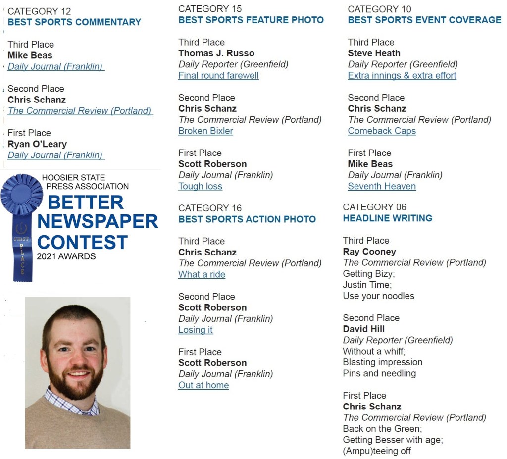 Commercial Review sports editor Chris Schanz had seven awards, the most of any journalist in Division III