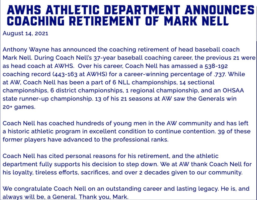 (8-14-21) Anthony Wayne tweeted today that veteran baseball coach Mark Nell was retiring. Nell who coached for 37 years ends his career 538-192, while Anthony Wayne he was 443-163 over 21 seasons.