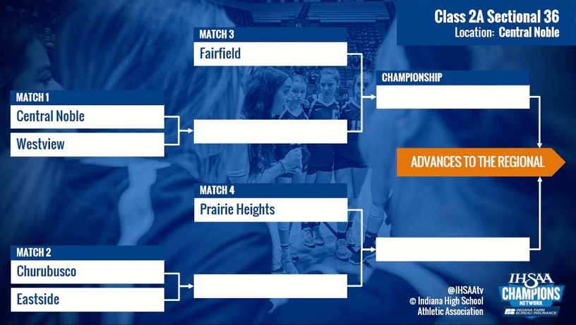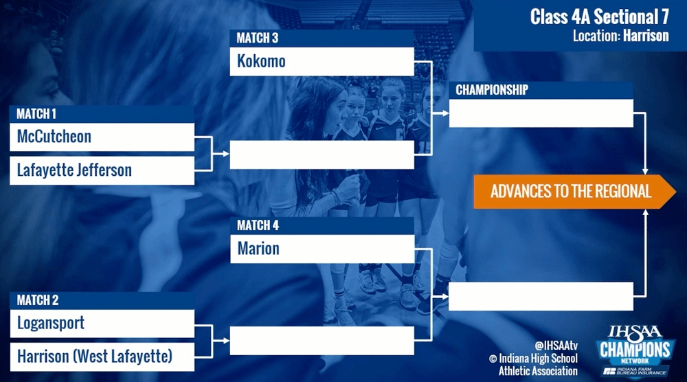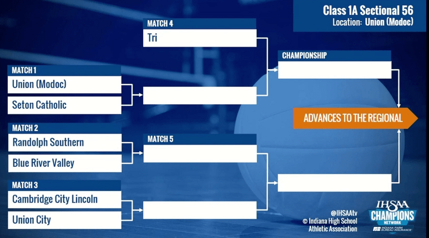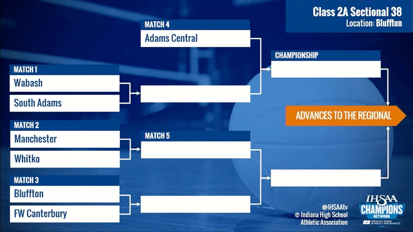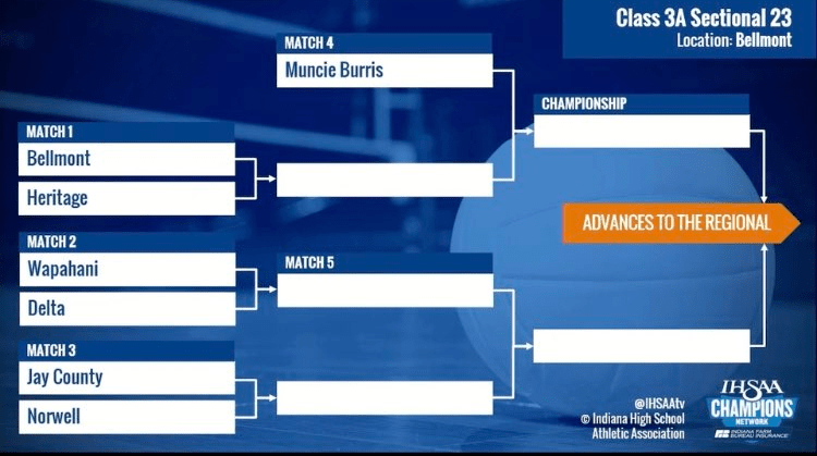 Those sectional champions will advance to a four-team regional on Saturday, Oct. 23, to be followed by a single semi-state round on Saturday, Oct. 30. The four state championship matches at Ball State University’s Worthen Arena are scheduled for Saturday, Nov. 6.