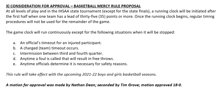 INDIANAPOLIS, IN. – During an Indiana High School Athletic Association Executive Committee meeting on October 7, the committee was offered a proposal for a basketball mercy rule at all levels of play and in the IHSAA state tournament (except for the state finals), a running clock will be initiated after the first half when one team has a lead of thirty-five (35) points or more.
