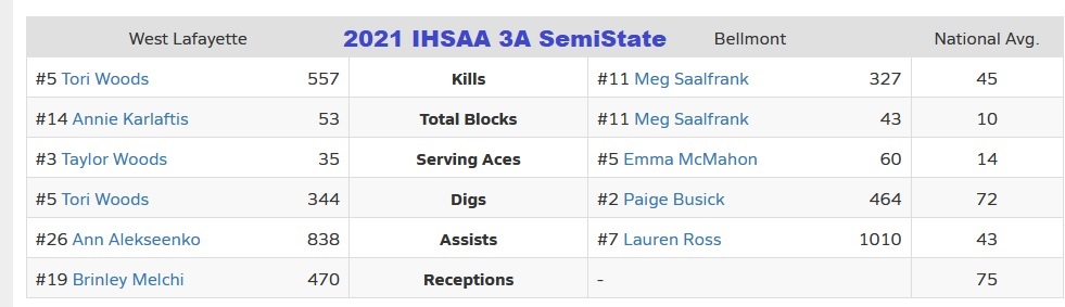 Bellmont was led by Meg Saalfrank in the final match who had 15 kills for the Braves, while Avery Ball, Jackie Sutter, Katelyn Rumschlag and Delaney Lawson each had seven. Mills and Saalfrank each had 2 aces, Paige Busick had 29 digs and Lauren Ross had 39 assists.