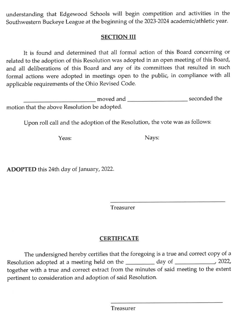 The Ross Local School District Board of Education adopted a resolution Jan. 20 accepting an invitation to join the SWBL starting in 2023-24.