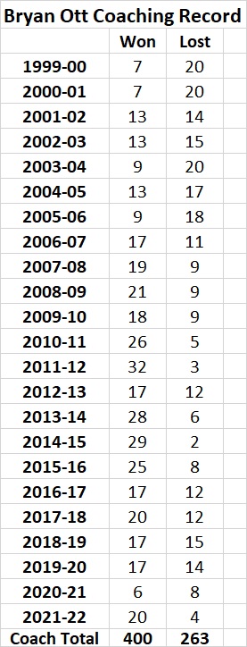 For Ott is has been a 23 year journey starting with the 1999-2000 season. Ott was building a program that had hit hard times, the year before he took over the Knights they were 4-23. It took Ott eight years to have his first winning season in 2006-07 going 17-11.