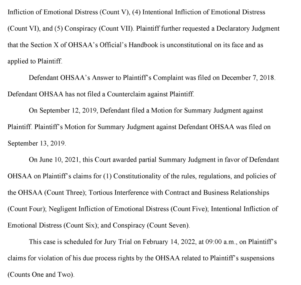 The civil jury trial will start in Franklin County Common Pleas Court on Valentine’s Day (Monday). The trial will focus on Everhart’s claim that the OHSAA violated his due process rights, interference with contract and business relationships, negligent infliction of emotional distress, intentional infliction of emotional distress and conspiracy.