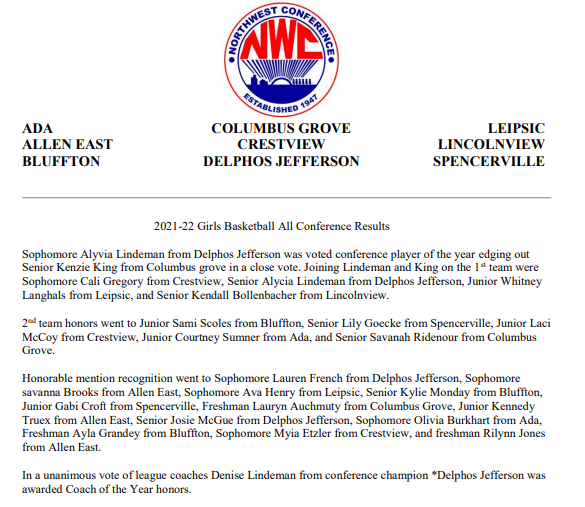 (2-15-22) Delphos Jefferson’s Alyvia Lindeman (Soph) was named the Northwest Conference Player of the Year. She was joined on the 1st team by her sister Alycia Lindeman, Linolnview’s Kendall Boolenbacher, Leipsic’s Whitney Langhals, Columbus Grove’s Kenzie King and Crestview’s Cali Gregory.