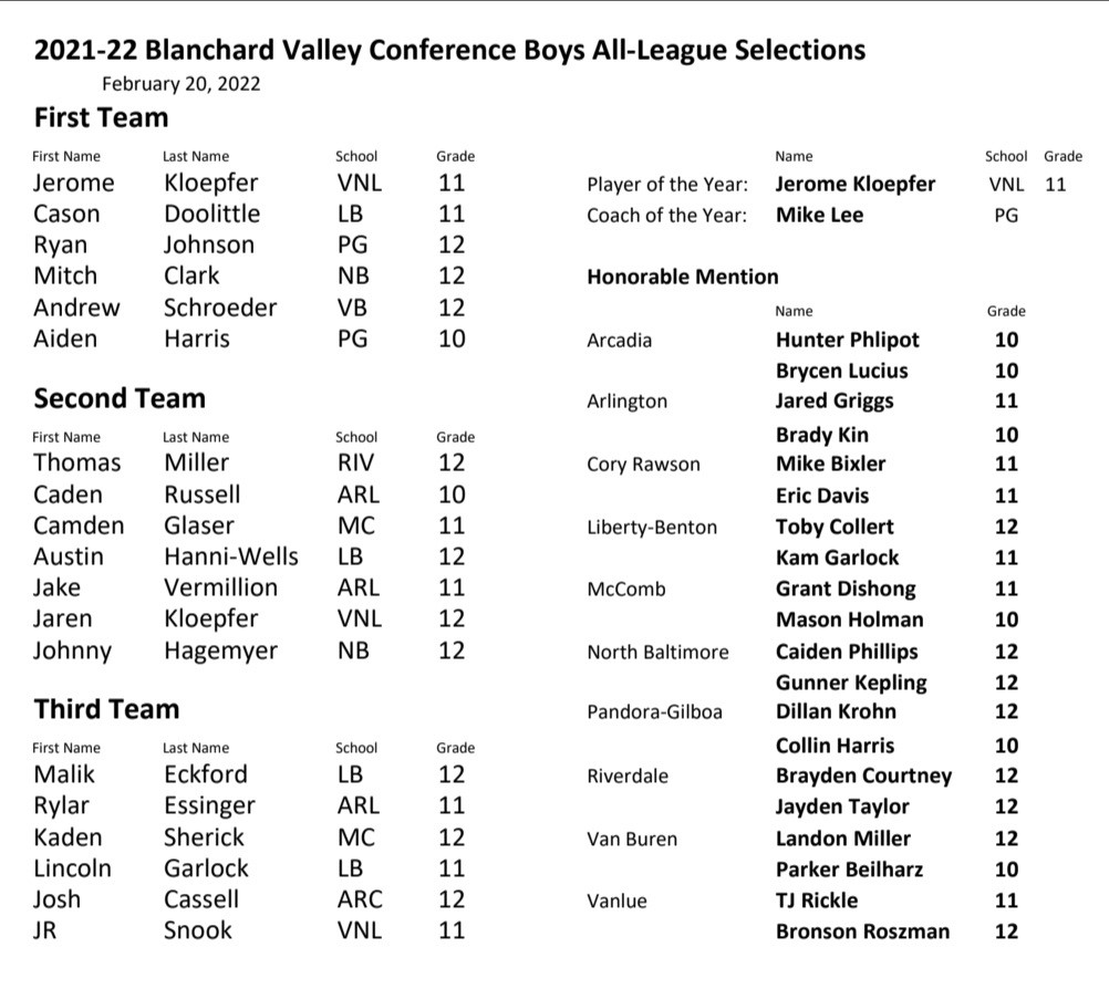 (2-22-22) The 2021-22 All-Blanchard Valley Conference (BVC) boys basketball team was named.