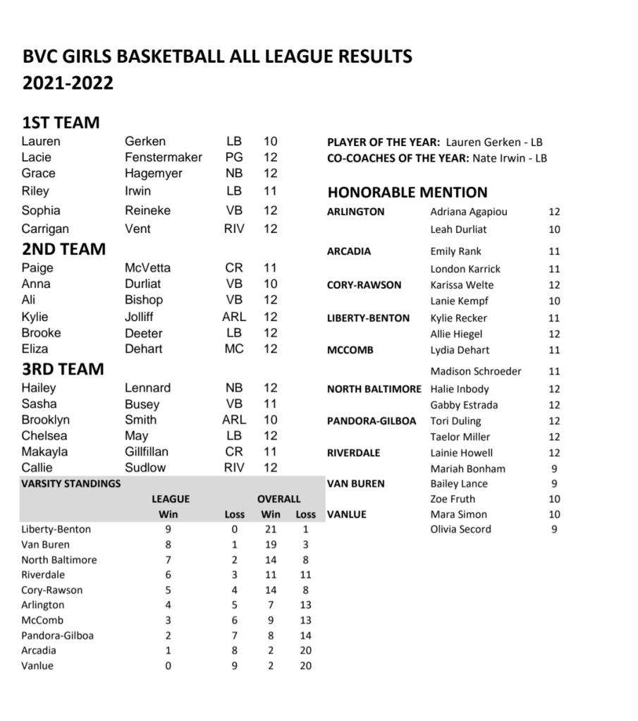 (2-22-22) The 2021-22 All-Blanchard Valley Conference (BVC) Girls basketball team was named.