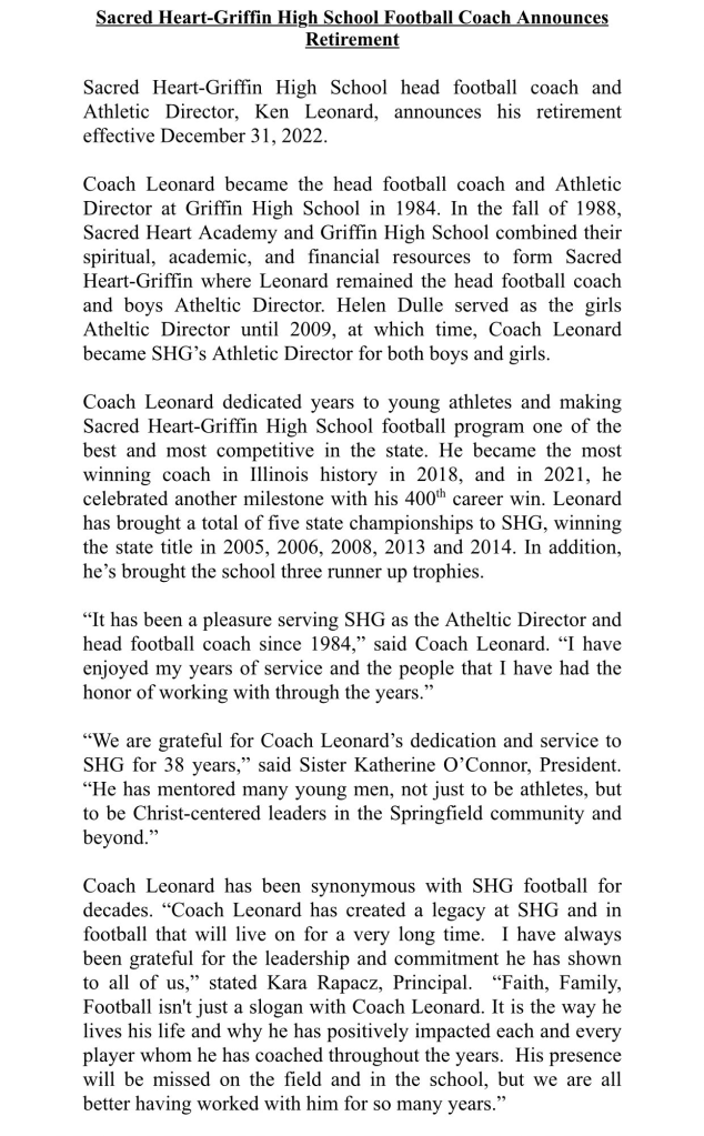 (2-25-22) Springfield Sacred-Heart-Griffin veteran football coach Ken Leonard has announced his retirement effective at the end of December.
